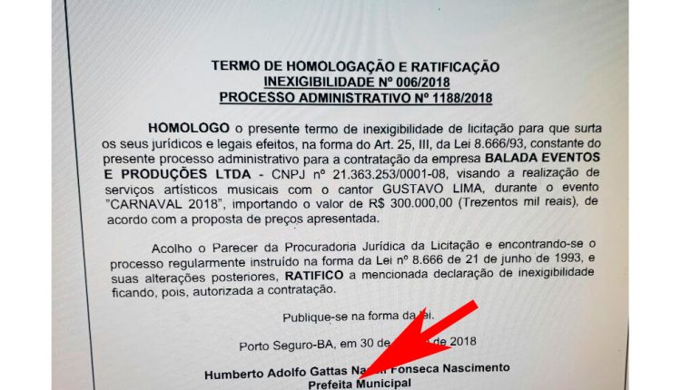 É isso mesmo leitores, “prefeita municipal”, não foi erro de redação nossa não, ta lá em letras garrafais, e assinado pelo prefeita municipal Humberto Nascimento, no termo de homologação e ratificação de inexigibilidade para contratação do cantor Gustavo Lima para o carnaval 2018 em Porto Seguro.