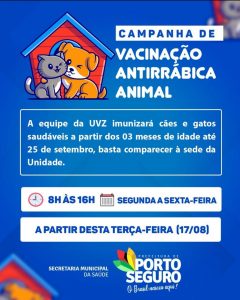 Os animais estão sendo vacinados na Unidade de Vigilância em Zoonoses (UVZ), no bairro Porto Alegre II, em Porto Seguro, de segunda à sexta-feira, das 8h às 16h.