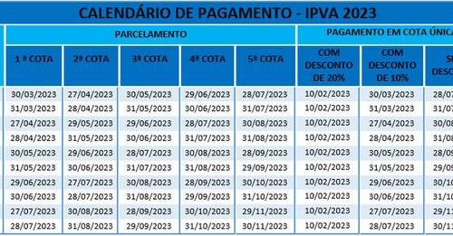 O Governo do Estado manteve, pelo segundo ano consecutivo, o percentual de desconto dobrado para quitação antecipada do IPVA. Também está valendo o desconto em dobro para quem deixar para fazer a quitação integral do IPVA na primeira cota do parcelamento, cuja data varia de acordo com o número final da placa do veículo: o abatimento, que, neste caso era de 5%, em 2023 continuará sendo de 10%. O parcelamento em cinco vezes, que poderá ser feito a partir de março, também está mantido. Para parcelar, é preciso que o valor devido seja no mínimo de R$ 120,00.