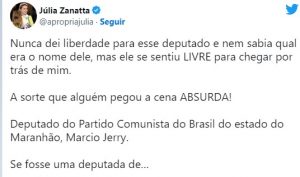 A deputada federal eleita por Santa Catarina, Júlia Zanatta (PL), veio às redes sociais para acusar o seu colega de parlamento, o deputado federal Márcio Jerry (PCdoB-MA), de praticar assédio contra ela durante sessão na Câmara. Em publicação realizada nesta quarta-feira (12), a parlamentar bolsonarista denunciou o caso e publicou uma foto em que Jerry aparece cheirando o pescoço de Zanatta.