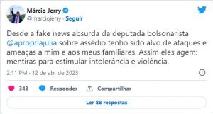 Em resposta, Jerry afirmou que a situação na verdade se trata de uma “armação” e acusou Zanatta de disseminar fake news. O deputado também realizou a publicação de um vídeo em suas redes sociais que, segundo ele, mostra a distorção do discurso da parlamentar de Santa Catarina: