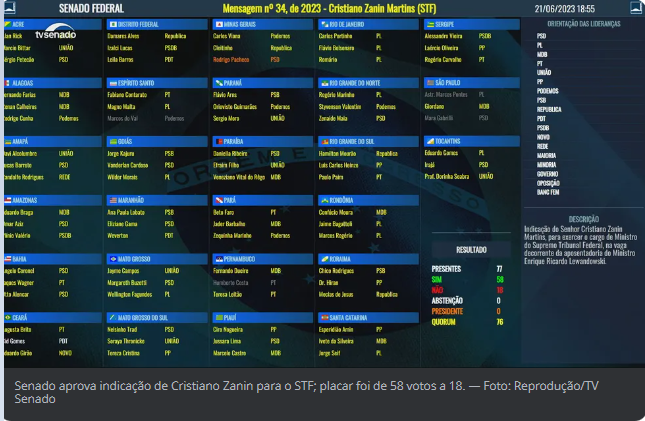 O plenário do Senado aprovou, por 58 votos a 18, nesta quarta-feira (21) o advogado Cristiano Zanin para a vaga de ministro deixada por Ricardo Lewandowski no Supremo Tribunal Federal (STF). Não houve abstenção.