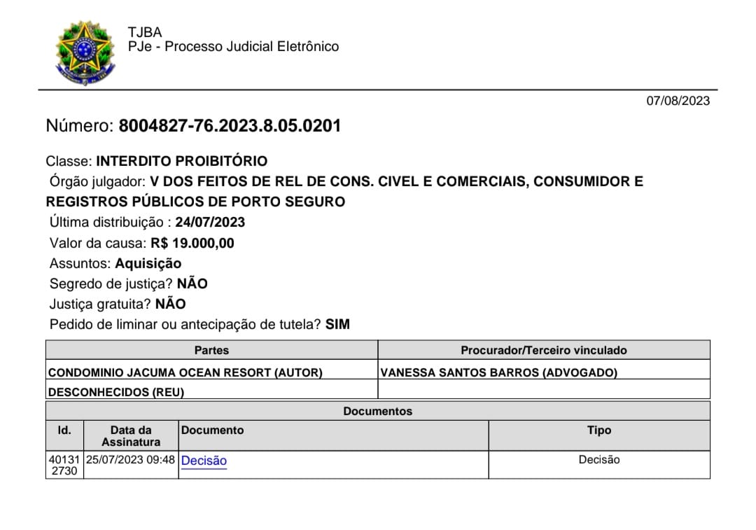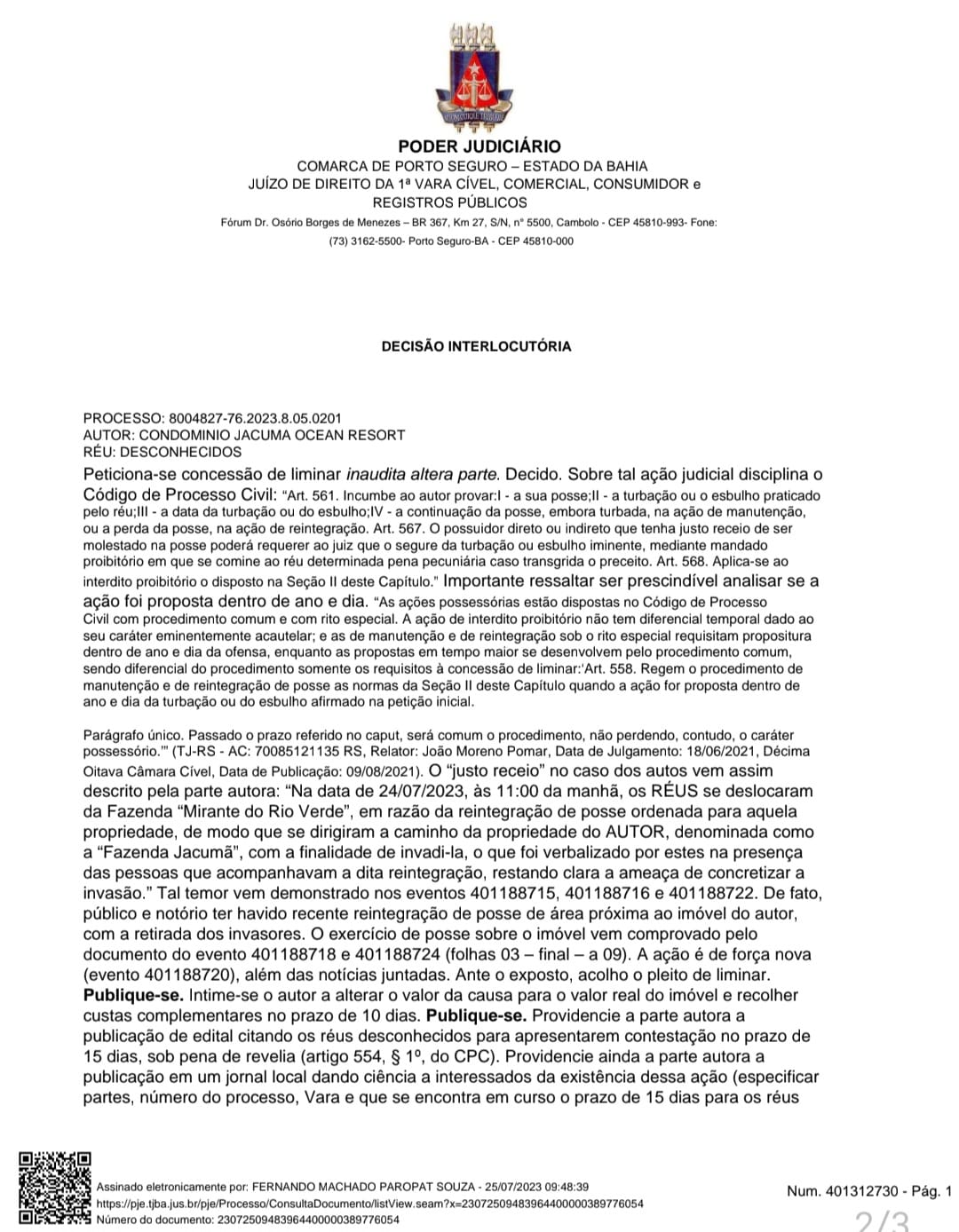 Com base nesses argumentos, o condomínio obteve uma decisão liminar favorável (Decisão Interlocutória), que determinou aos réus para que não pratiquem qualquer ato de ameaça, turbação ou esbulho contra a propriedade da Fazenda Jacumã, sob pena de multa de R$ 5.000,00. Essa decisão foi fundamentada no artigo 562 do Código de Processo Civil, que prevê a concessão de medida liminar nas ações possessórias quando houver fundado receio de dano iminente e irreparável.
