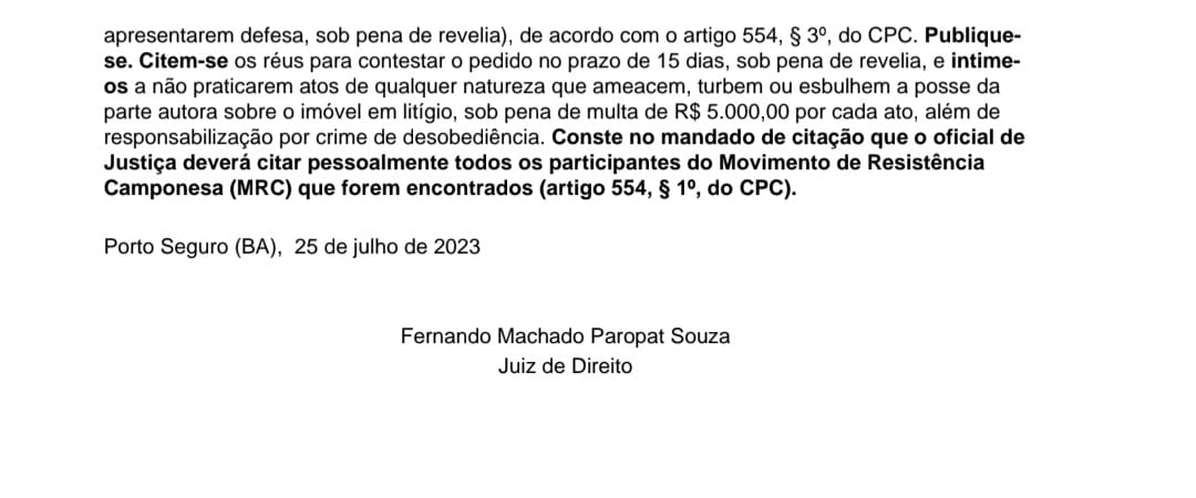 Em sua decisão, o Juiz Fernando Machado Paropat, da 1ª Vara Cível, Comercial, Consumidor e Registros Públicos, cita desconhecidos e o MRC para apresentarem defesa, sob pena de revelia, de acordo com o artigo 554, § 3º, do CPC. “Citem-se os réus para contestar o pedido no prazo de 15 dias, sob pena de revelia, e intime-os a não praticarem atos de qualquer natureza que ameacem, turbem ou esbulhem a posse da parte autora sobre o imóvel em litígio, sob pena de multa de R$ 5.000,00 por cada ato, além de responsabilização por crime de desobediência. Conste no mandado de citação que o oficial de Justiça deverá citar pessoalmente todos os participantes do Movimento de Resistência Camponesa (MRC) que forem encontrados (artigo 554, § 1º, do CPC)” diz trecho do edital de citação.