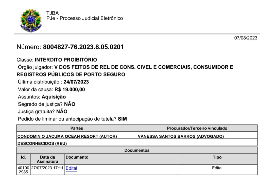 Diante desse cenário, o condomínio decidiu ajuizar uma ação judicial de interdito proibitório (Processo Nº 800 4827- 76.2023. 8.05.0201) que é um mecanismo processual de defesa da posse que está em iminência de ser molestada, ou encontra-se ameaçada de forma implícita ou expressa. O objetivo dessa ação é impedir que os invasores pratiquem qualquer ato de agressão à posse do condomínio, sob pena de multa diária.