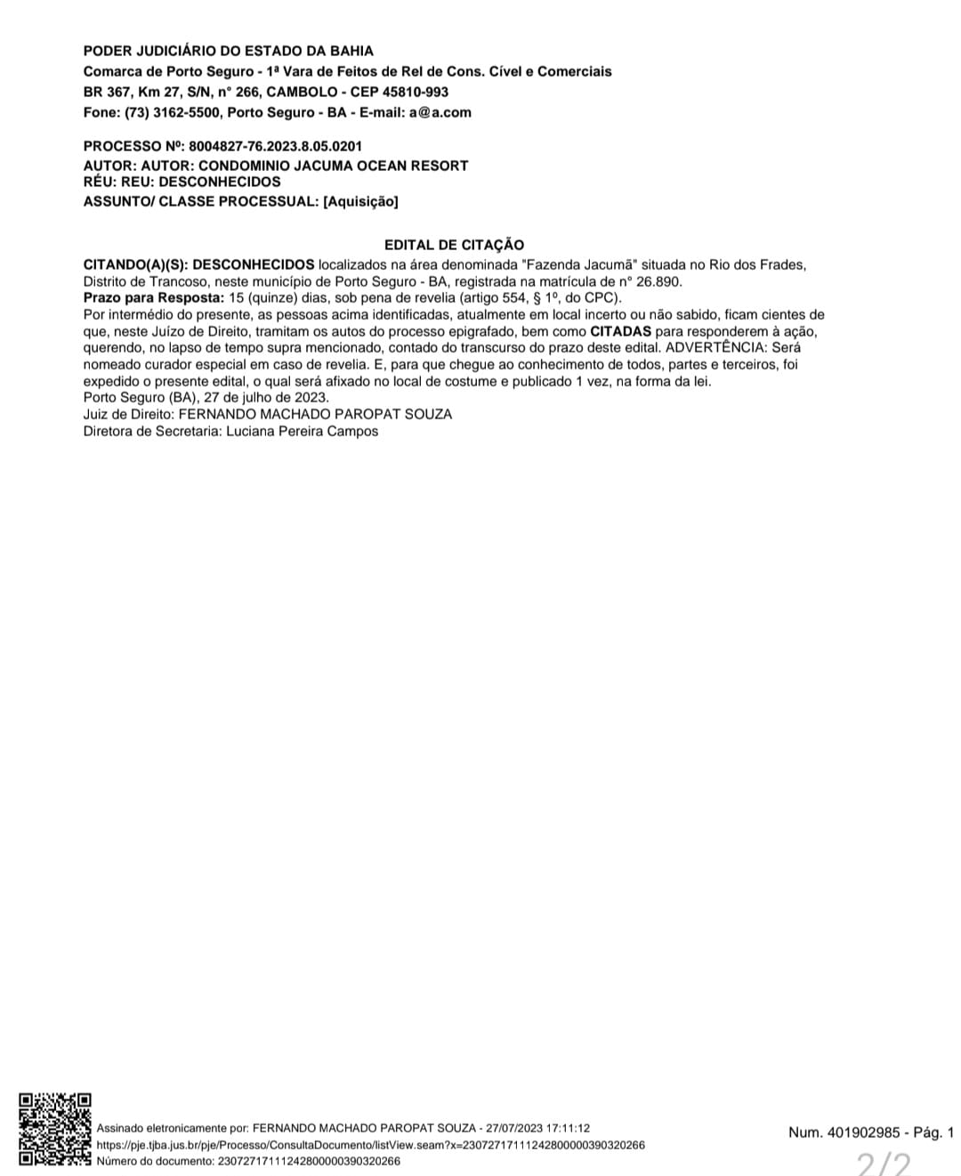 Justiça concede liminar ao Condomínio Jacumã em Trancoso e prevê multa de 5 mil por cada ato e por desobediência do MRC