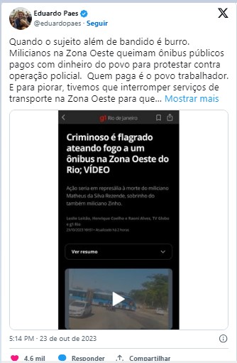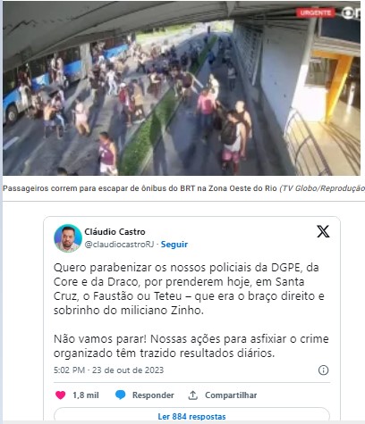 O governador do estado, Cláudio Castro (PL), que dará uma entrevista coletiva em instantes, em sua rede social elogiou a atuação da Policia Civil. “Não vamos parar! Nossas ações para asfixiar o crime organizado têm trazido resultado diários”. O prefeito do Rio, Eduardo Paes, também em sua rede social afirmou: “Como prefeito, apelo ao governo do estado e ao Ministério da Justiça para que atuem para impedir que fatos assim se repitam”.