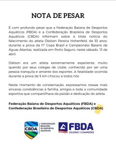 Foi com grande pesar que recebemos e divulgamos a notícia do falecimento do nadador Dielson Pereira Hohenfeld, de 53 anos, ocorrido neste sábado, dia 13 de abril, em Porto Seguro. Dielson estava participando de uma prova nacional de 5 km- 11ª Copa do Brasil e Campeonato Baiano da Águas Abertas – promovida pela Federação Baiana de Desportos aquáticos (FBDA), com o apoio da Confederação Brasileira de Desportos Aquáticos (CBDA), quando infelizmente não retornou para a areia.
