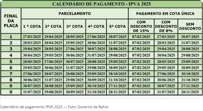 De acordo com o Departamento Estadual de Trânsito da Bahia (Detran-BA), o licenciamento completo do veículo engloba outros itens além do IPVA, ou seja, para o automóvel estar regularizado é necessário quitar também débitos do licenciamento anual e multas, se houver. O prazo para ficar em dia com a documentação do veículo termina na data do vencimento da quinta parcela do imposto.