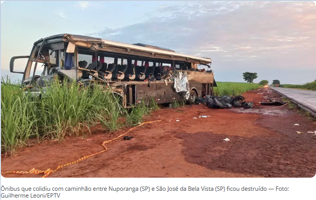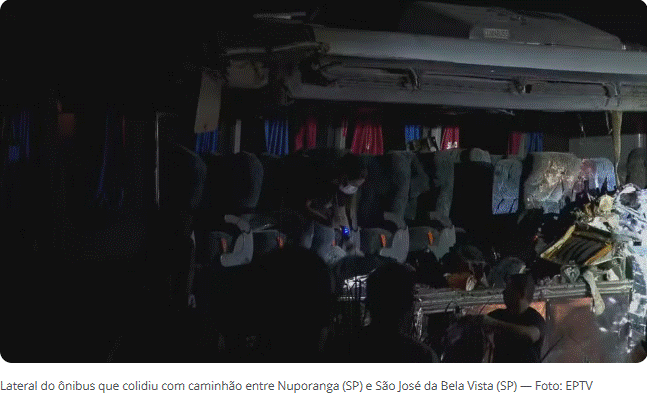 Um acidente na noite de quinta-feira (20) entre um ônibus com universitários e um caminhão deixou ao menos 12 mortos e 19 feridos na rodovia Waldir Canevari (SP-355/330), na região de Ribeirão Preto (SP). O trecho da rodovia onde a batida aconteceu é de pista simples. A colisão ocorreu entre os municípios de Nuporanga (SP) e São José da Bela Vista (SP)