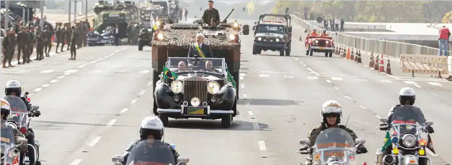 O presidente Lula chegou à Esplanada em carro aberto, o Rolls-Royce presidencial tradicionalmente usado nesta cerimônia, após passar em revista as tropas próximas ao Palácio do Planalto.