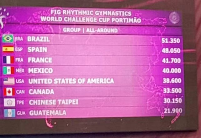Como resultado, o Brasil superou o conjunto da Espanha, com 48.050 pontos, e da França, com 41.700, que ficaram com a prata e o bronze, respectivamente. A nota da apresentação deste sábado foi composta por 5.50 e 7.10 pontos de dificuldades de corpo e aparelho, somadas a 7.300 de nota artística e 6.250 pela execução.