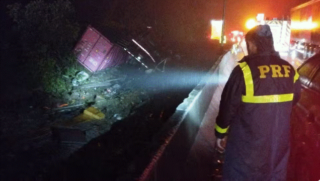Por volta das 5h20, a PRF disse ainda que aguardava a chegada de um guindaste para içar a carreta com o contêiner e retirar os corpos. Ao todo, 10 ocupantes estavam na van.