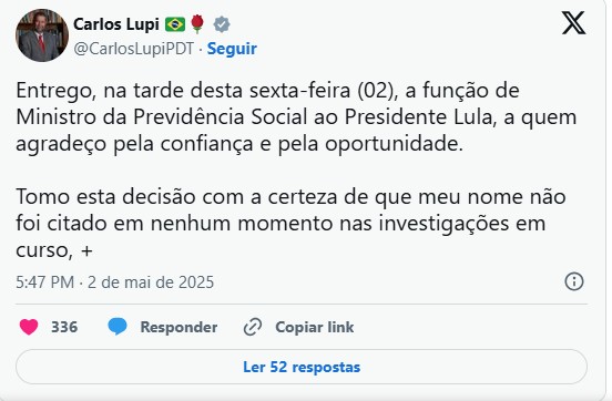 Meu nome não foi citado em nenhum momento nas investigações, afirmou Lupi, em publicação no X. “Faço questão de destacar que todas as apurações foram apoiadas, desde o início, por todas as áreas da Previdência, por mim e pelos órgãos de controle do governo Lula. Espero que as investigações sigam seu curso natural, identifiquem os responsáveis e punam, com rigor, aqueles que usaram suas funções para prejudicar o povo trabalhador”, escreveu.