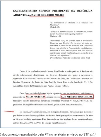 “De início, devo dizer que sou, em meu país de origem, perseguido por motivos e por delitos essencialmente políticos. No âmbito de tal perseguição, recentemente, fui alvo de diversas medidas cautelares. Para decretação de tais medidas foram mencionados os delitos dos Arts. 359-I e 359-M do Código Penal brasileiro”, diz o texto encontrado no celular de Bolsonaro, segundo a PF.
