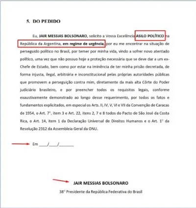 O documento possui 33 páginas e o conteúdo remete a um pedido de asilo político ao presidente da República Argentina, Javier Milei, por parte do ex-presidente. A fundamentação introdutória, constante da primeira página do documento, seria a alegação de perseguição política no Brasil: