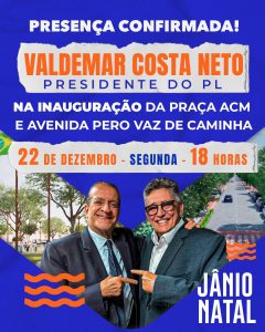 Inauguração da nova Praça ACM e da Avenida Pero Vaz de Caminha ganha presença confirmada do presidente nacional do PL, Valdemar da Costa Neto