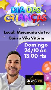 O cantor Marcos Val, um dos artistas mais queridos e carismáticos de Porto Seguro, volta a mostrar que seu talento vai muito além dos palcos. Conhecido por suas ações solidárias em diversos bairros da cidade, o artista realiza neste domingo, 26 de outubro, uma grande festa infantil no Bairro Vila Vitória, em frente à Mercearia Ivo, a partir das 13h.
