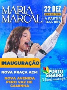 Além do simbolismo institucional e do forte peso político, a inauguração da Praça ACM e da nova Avenida Pero Vaz de Caminha também será marcada por um clima de celebração e emoção. A animação do evento ficará por conta da jovem cantora Maria Marçal, um dos grandes nomes da música gospel da nova geração, que vem conquistando o público em todo o Brasil com sua voz marcante e mensagens de fé e esperança. A apresentação promete atrair grande público e transformar a inauguração em um momento especial de confraternização entre as famílias de Porto Seguro, unindo cultura, música e celebração em uma noite histórica para o município.