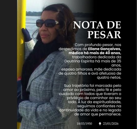 Faleceu nesta sexta-feira (23/01), em Porto Seguro, a médica Dra. Eliane Gonçalves, profissional que dedicou mais de quatro décadas ao exercício da medicina e mais de 35 anos à vivência e ao trabalho na Doutrina Espírita. Sua partida deixa um profundo sentimento de pesar entre familiares, pacientes, amigos e integrantes do movimento espírita da região.