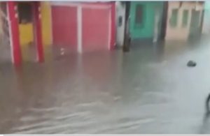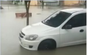 Por causa da chuva, uma pessoa ficou desabrigada. Os moradores compartilharam vídeos das ruas completamente alagadas na cidade.