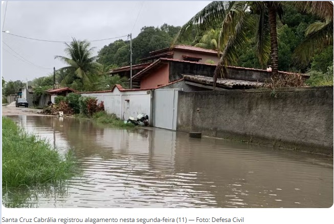 Uma das cidades que registrou alagamento durante a manhã foi Santa Cruz Cabrália. No entanto, conforme a prefeitura do município, nenhum morador ficou desalojado ou desabrigado.