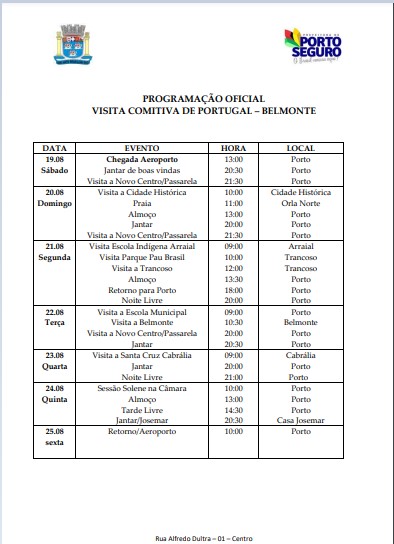 O ponto alto da visita será na quinta-feira, 24 de agosto, quando haverá uma sessão solene na Câmara de Vereadores de Porto Seguro, com a presença dos vereadores e de secretários municipais. Na ocasião, o Dr. Antônio Pinto Dias Rocha, chefe da delegação, fará um pronunciamento da Tribuna da Casa, cujo teor e conteúdo traz grandes expectativas.