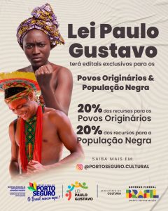 Atenção galera da Cultura! A prefeitura de Porto Seguro, por meio da Secretaria de Educação, Cultura e Patrimônio Histórico, informa que a Lei Paulo Gustavo terá editais exclusivos para os povos indígenas e para a população negra. Isso mesmo! Do quantitativo geral da Lei, 20% das verbas dos editais serão revertidas para projetos propostos por indígenas e 20% para negros. Serão mais de meio milhão de reais destinados a esses grupos. Essa é uma forma de contemplar aqueles que tem tanto a contar sobre a força, a beleza e a importância da nossa ancestralidade.
