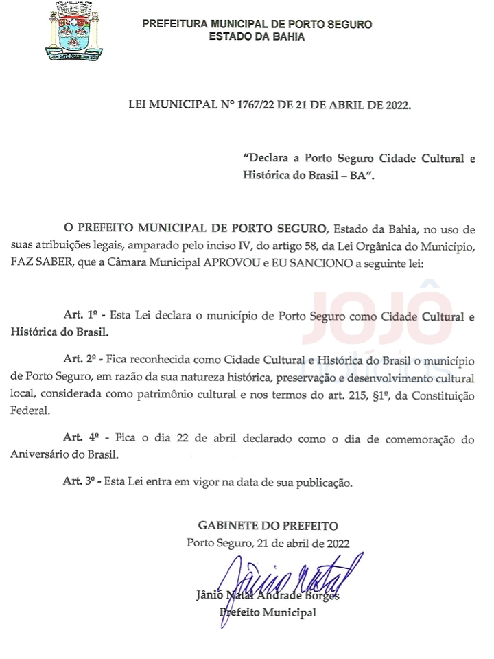 Uma justa homenagem, que terá seu pedido de ratificação, a nível nacional, feito pelo prefeito Jânio Natal ao presidente Jair Bolsonaro, neste 22 de abril, para ser institucionalizada e oficializada como cidade oficial para a comemoração do aniversário do Brasil, conforme prevê a lei aprovada.