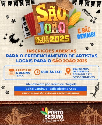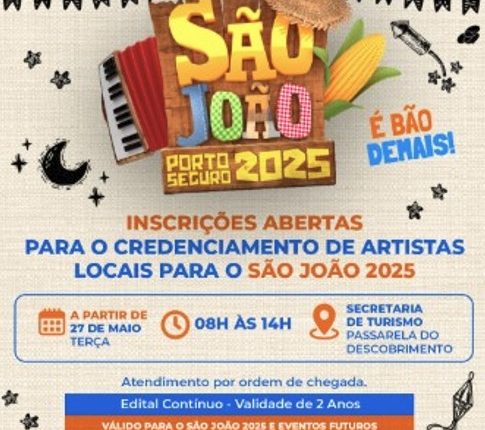 A Secretaria de Turismo de Porto Seguro abre inscrições para o maior edital cultural já realizado no município, exclusivo para moradores, nesta terça-feira, (27/05). O processo de credenciamento contempla bandas, artistas solos, grupos de dança, agremiações culturais e de expressões musicais de diversos estilos, visando compor o calendário anual de eventos da cidade, incluindo a programação do São João 2025.