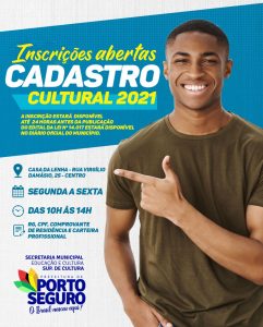 “Atenção profissionais da cultura! Para darmos continuidade a lei Aldir Blanc e executarmos o edital de premiação, será necessário a realização da sua inscrição no Cadastro da Cultura 2021! Quem pode se inscrever? Profissionais de artes cênicas, literatura, música, áudio e vídeo, culturas identitárias, artesanato, artes visuais, artes plásticas… quais documentos são necessários”?