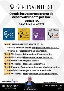 Caraíva receberá entre os dias 14 e 22 de junho, na Pousada Lagoa, uma série de palestras, workshops e oficinas, em temas variados sobre planejamento. Projetos sociais, gestão de projetos, planejamento do empreendedor e da vida, potência máxima nos relacionamentos, enfim, esses são alguns assuntos do Reivente-se Caraíva 2021, um programa de desenvolvimento pessoal, cuja missão é apoiar pessoas e empresas no processo de transformação e aperfeiçoamento pessoal, para o desenvolvimento de sua melhor versão.