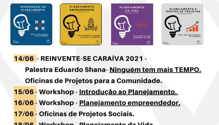 Caraíva receberá entre os dias 14 e 22 de junho, na Pousada Lagoa, uma série de palestras, workshops e oficinas, em temas variados sobre planejamento. Projetos sociais, gestão de projetos, planejamento do empreendedor e da vida, potência máxima nos relacionamentos, enfim, esses são alguns assuntos do Reivente-se Caraíva 2021, um programa de desenvolvimento pessoal, cuja missão é apoiar pessoas e empresas no processo de transformação e aperfeiçoamento pessoal, para o desenvolvimento de sua melhor versão.