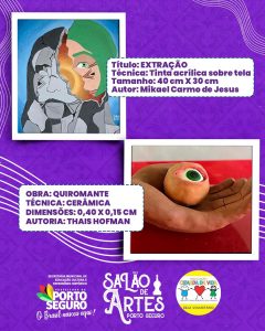 O Salão de Artes de Porto Seguro, com abertura marcada para o dia 03 de junho de 2023, apresenta os artistas e suas obras doadas, que farão parte do primeiro leilão beneficente, com renda revestida para a Associação Ciranda da Vida, entidade sem fins lucrativos e de utilidade pública que, desde 2010, apoia pacientes com câncer, ex-pacientes, familiares e cuidadores, com a ajuda de voluntários, tornando mais humana a passagem pelo tratamento.