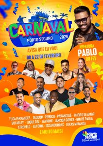 Com o tema “Avisa que eu vou!”, o Carnaval de Porto Seguro acontecerá entre os dias 8 e 22 de fevereiro, prometendo transformar a Terra Mãe do Brasil em um verdadeiro polo mundial da pipoca, da cultura e da diversão. Segundo o secretário de Turismo, Guto Jones, a proposta é unir tradição, identidade cultural e grandes atrações musicais.