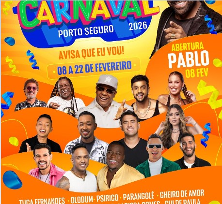 Com o tema “Avisa que eu vou!”, o Carnaval de Porto Seguro acontecerá entre os dias 8 e 22 de fevereiro, prometendo transformar a Terra Mãe do Brasil em um verdadeiro polo mundial da pipoca, da cultura e da diversão. Segundo o secretário de Turismo, Guto Jones, a proposta é unir tradição, identidade cultural e grandes atrações musicais.