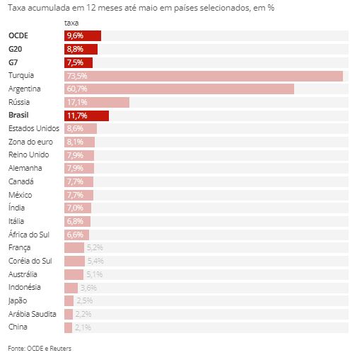 Na média dos países do G20, a inflação em 12 meses atingiu 8,8% em maio, contra 8,5% em abril. No grupo dos países do G7, a taxa avançou para 7,5%, ante 7,1% no mês anterior.