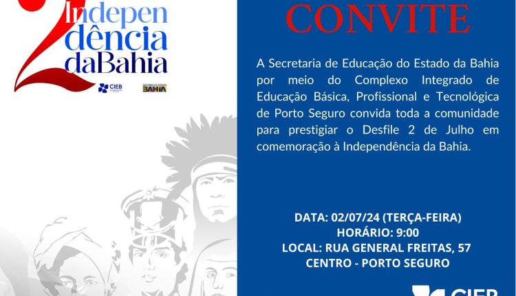 Neste intuito, o Complexo Integrado de Educação Básica, Profissional e Tecnológica de Porto Seguro (CIEB) vem por meio deste, informar que o nosso tradicional desfile cívico em comemoração ao 02 de Julho – Independência da Bahia terá a seguinte programação: