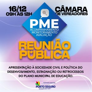 Temos a honra de convidar toda a população do Município de Porto Seguro/BA, Conselheiros Municipais, CME, Fórum de Educação, Poder Legislativo, Poder Executivo, MP, Secretarias Municipais, Pais, Professores e Alunos para uma reunião pública, que possui caráter analítico e propositivo, conforme determina a Lei Municipal do Plano Municipal de Educação-PME, nº 1.240/2015.