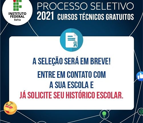“Seu ingresso será possível por meio da análise de histórico escolar. Por isso é importante que você solicite o documento com antecedência”, alerta o IFBA em nota divulgada.