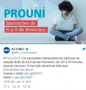 O edital do Prouni foi publicado no Diário Oficial da União desta segunda-feira (15). As inscrições para o Programa Universidade para Todos (Prouni) do primeiro semestre de 2018 estarão abertas entre os dias 6 e 9 de fevereiro. O programa oferece bolsa de estudo parciais e integrais no ensino superior.