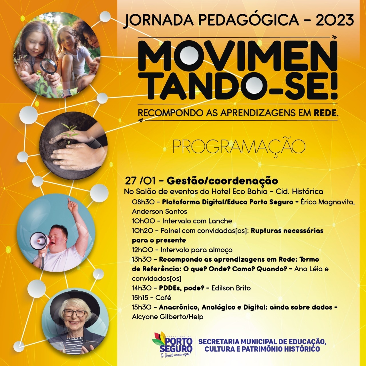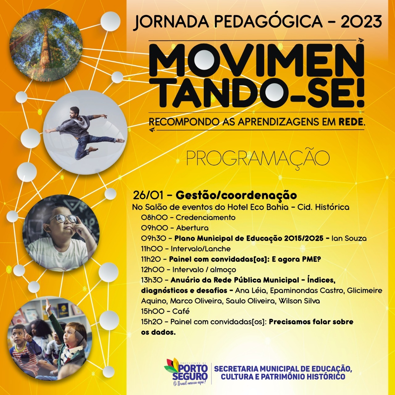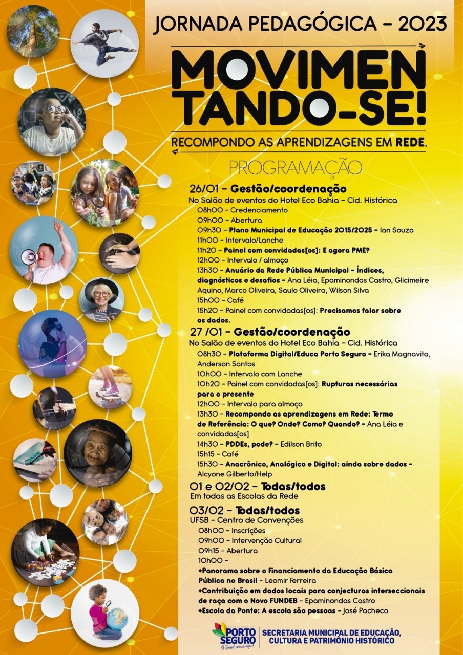 Temas como o Plano Municipal de Educação 2015/2025, Termo de Referência para Atuação em 2023, Plataforma Educa Porto Seguro e o Anuário da Rede Pública Municipal serão discutidos no primeiro dia do evento. Já no dia 27, os temas abordados serão: a Plataforma Digital Educa Porto Seguro, a recomposição da aprendizagem na rede municipal de Educação, o Programa Dinheiro Direto na Escola – PDDE – e a análise e processamento de dados no âmbito da Educação.