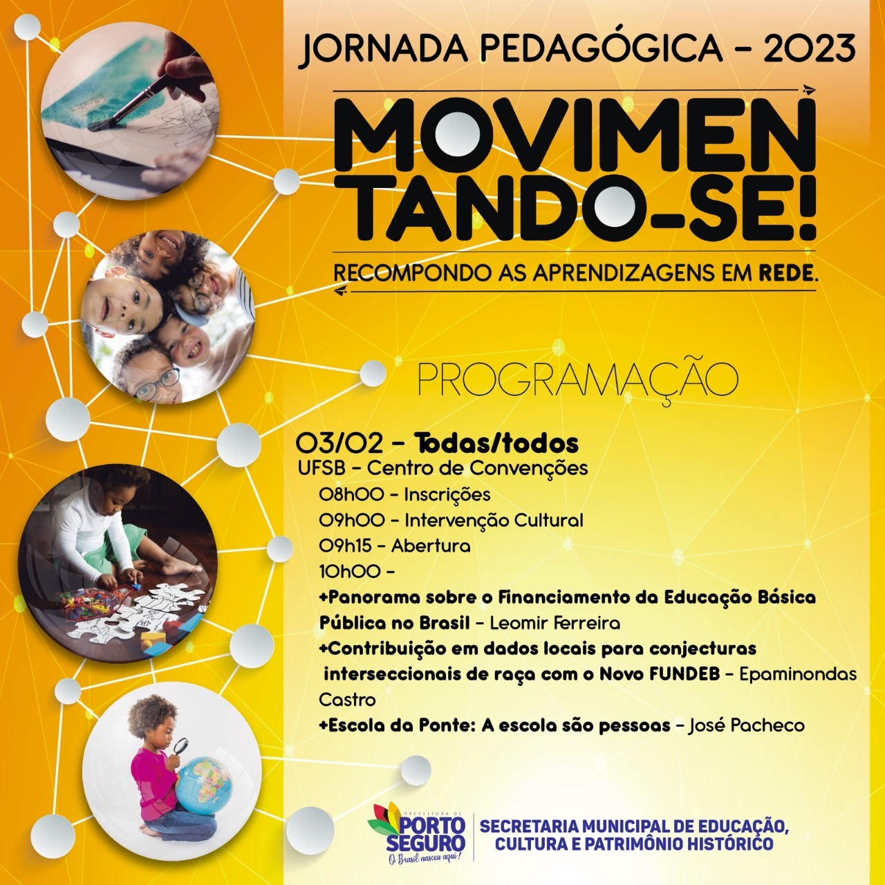 No encerramento da Jornada Pedagógica, dia 03/02, serão ministradas as palestras: “Panorama sobre o Financiamento da Educação Básica Pública no Brasil”, com Leomir Ferreira; “Contribuição em dados locais para conjecturas interseccionais de raça com o Novo Fundeb”, com Epaminondas Castro e “Escola da Ponte: a escola são pessoas”, com José Pacheco.