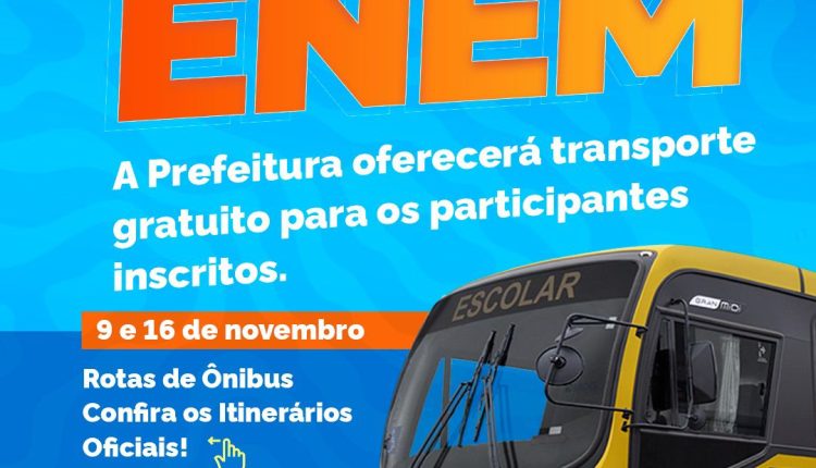 A Prefeitura de Porto Seguro, por meio da Secretaria Municipal de Educação, vai disponibilizar ônibus escolares para auxiliar no deslocamento dos estudantes que farão as provas do Exame Nacional do Ensino Médio (ENEM), nos dias 9 e 16 de novembro. A iniciativa tem como objetivo facilitar o acesso dos alunos aos locais de prova e reforçar o compromisso da gestão com a Educação e o futuro dos jovens do município.