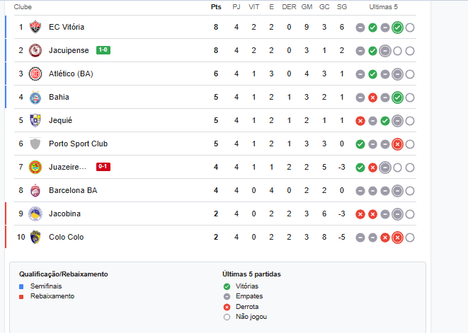 Veja abaixo a tabela de classificação do campeonato baiano-2025