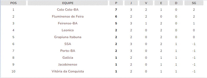 No outro jogo do sábado, o Colo Colo derrotou a equipe do Porto por 1X0, no Estádio Mário Pessoa, em Ilhéus. Com a vitória, o Tigre assumiu a liderança provisória na tabela de classificação, com 7 pontos, ultrapassando o Fluminense de feira, que tem 6, mas ainda joga na rodada. Já a equipe de Porto Seguro aparece em 6º com 2 pontos, em três jogos realizados.