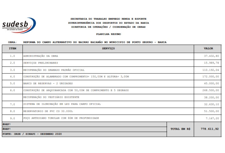Veja abaixo a planilha de custos do Estádio Guiamunzão: