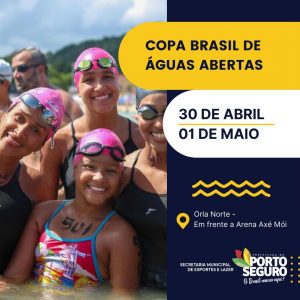 A Copa Brasil de Águas Abertas acontece entre os dias 30 de abril e 1º de maio, com provas de 1.5km, 2.5km e 5km, pela primeira vez em Porto Seguro. A programação inclui a disputa do Troféu Ana Marcela Cunha, para as categorias de base (mirim e petiz), com metragens de 250m e 500m, que leva o nome da baiana campeã olímpica da modalidade. Além das provas da Copa Brasil serão disputadas, paralelamente, provas do Campeonato Baiano, na manhã no sábado e domingo, na praia de Taperapuan, classificando os melhores atletas para a tradicional Travessia Itaparica – Salvador, em dezembro.