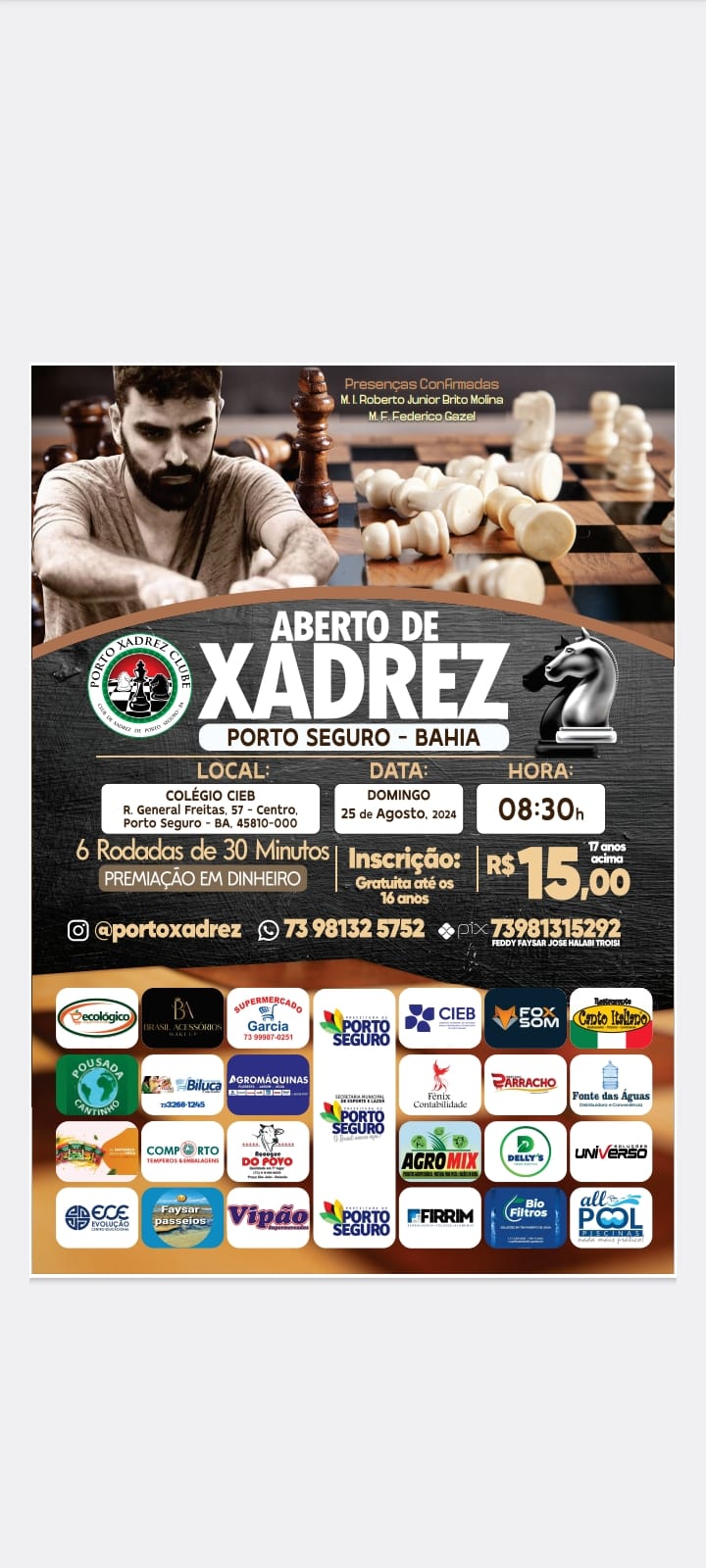 Neste sábado 24 de agosto, a partir das 15h30 um grande evento de xadrez está programado para o Espaço Mamagaya, na Orla Norte da cidade. Com palestras, simultâneas e confreternização. O evento acontecerá no espaço Mamagaya, ao lado da rotatória do Outeiro da Glória, na br-367, sentido Cabrália. Com as presenças de Frederico Gazel e do LM Roberto Molina, o evento deve se estender até às 18horas e é uma oportunidade ímpar para praticantes e admiradores do esporte