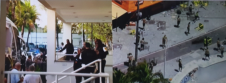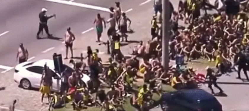 O tumulto teria começado com um furto na avenida Lúcio Costa. Em imagens, é possível ver homens armados com pedaços de madeira e ferro em meio a uma briga generalizada na areia.